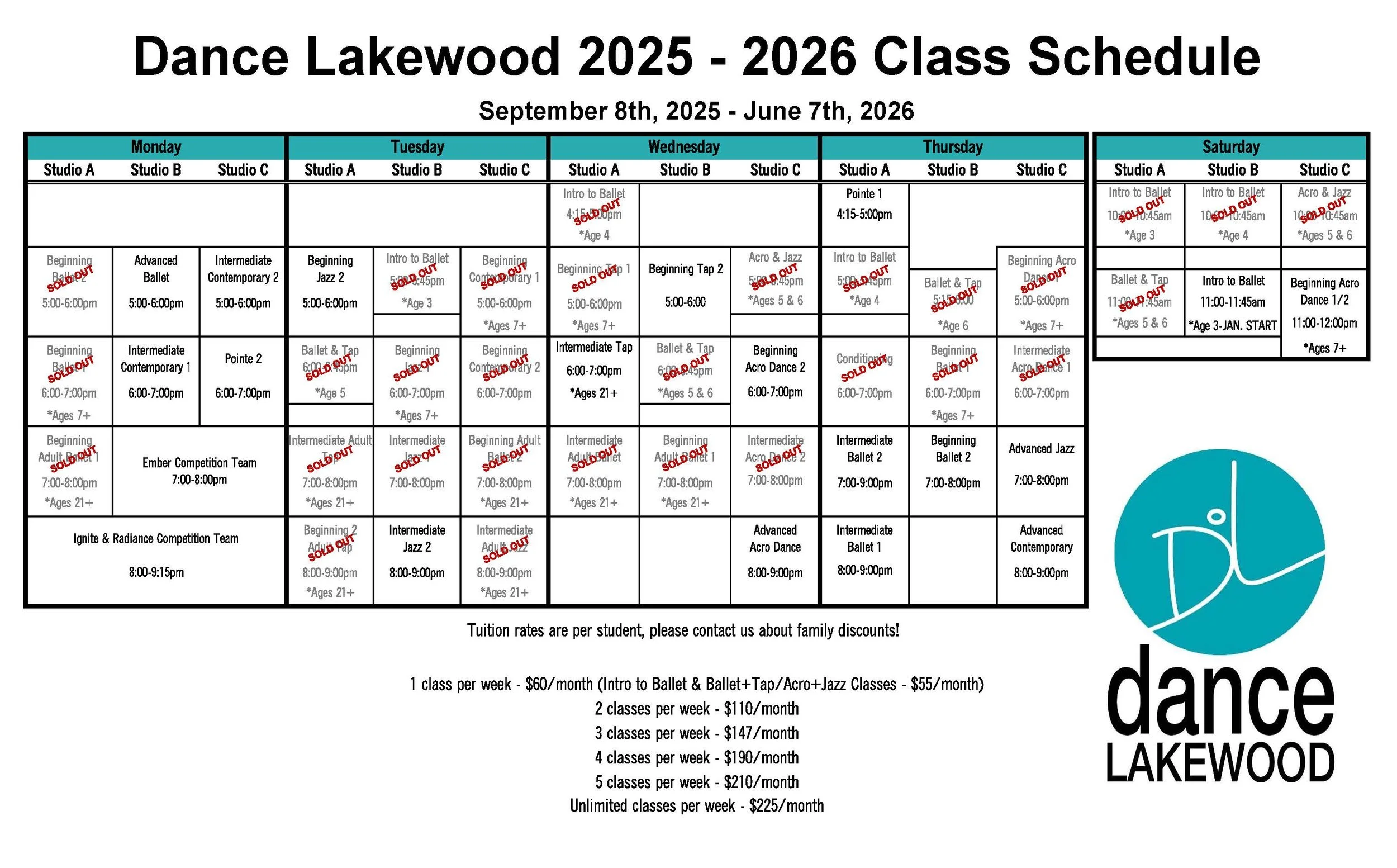 Our school-year session will run from September 8 - June 7. Current student and new student registration is now open. To register, please email us at contact@dancelakewood.com with your/your student’s name and desired class. We will respond with a confirmation and a link to pay a $20 registration fee. All tutition will be handled monthly during the session. If the class you want is sold out, please reach out to be put on the waiting list. If you have questions, please don’t hesitate to email us! Our season will conclue in an all-studio recital on June 7th. For more information on recital costs, please navigate to “Parents > Recital & Showcase.”